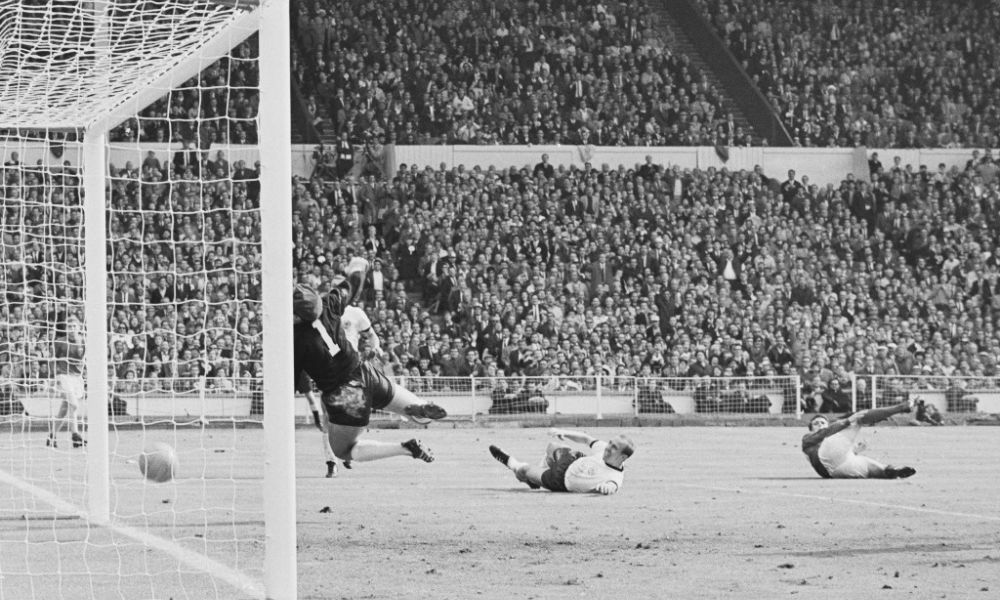 Photo of Geoff Hurst's phantom goal which decided the 1966 World Cup final between England and Germany. Today it is still debated whether the ball entered the goal completely. Currently, the original crossbar from which the phantom goal ricochet is displayed in the new Wembley stadium, as a symbol of the only World Cup won by England.