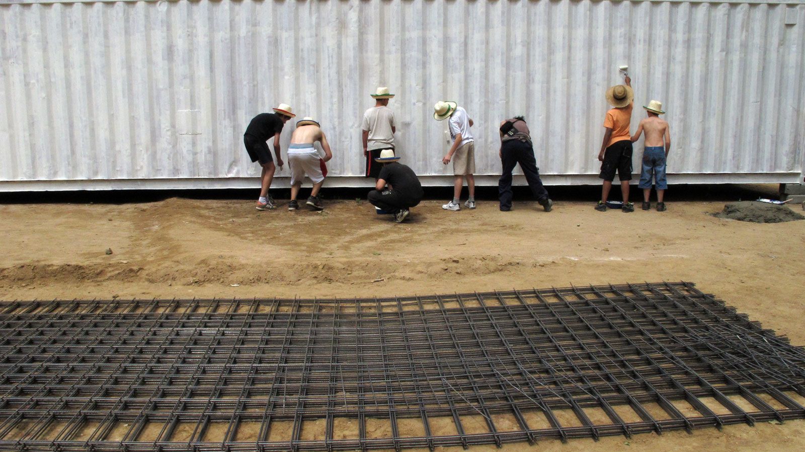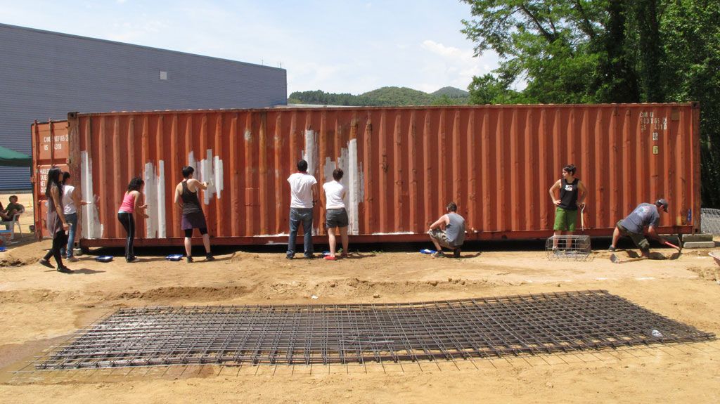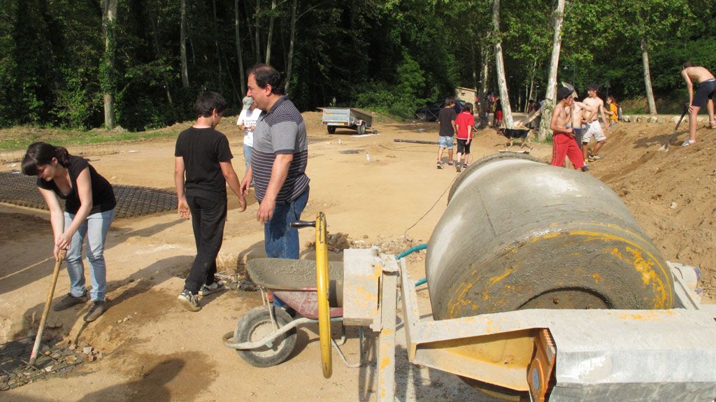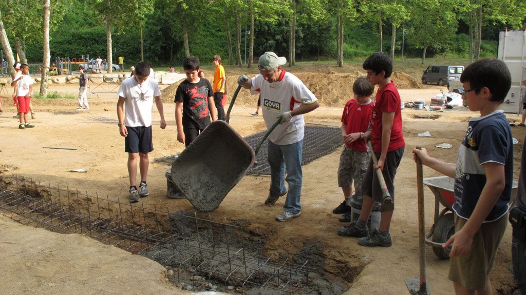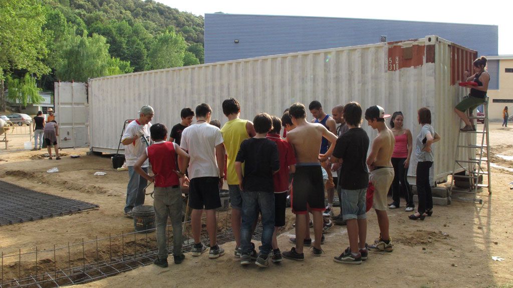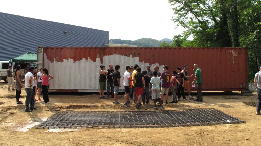 La puesta en obra arrancó con la llegada del contenedor. En el mismo día se ejecutaron los primeros movimientos de tierras, la excavación de zanjas para cimientos y un apisonado en las zonas de solera y rampas. A partir de entonces, como el proyecto fue realizado de forma colaborativa entre jóvenes y adultos no expertos en construcción, el proceso se realizó mediante reuniones en formato taller. El primer taller fue dedicado al diseño del skatepark. Esto se hizo en un encuentro con los jóvenes de Arbúcies en el que, con ayuda de expertos, se realizó una toma de decisiones respecto al diseño del skatepark de manera colaborativa. Durante el fin de semana siguiente se realizó el primer taller de autoconstrucción, en el que diversos grupos de trabajo se encargaron de armar y hormigonar las zapatas, repasar el movimiento de tierras, pintar el contenedor y construir encofrados para quarterpipes a partir de material nuevo y reciclado. Una semana más tarde, en el segundo taller, se continuó con el trabajo sobre los encofrados, reforzándolos y protegiéndolos contra la humedad, y se comenzó a levantar el muro de contención que complementaba el contenedor. En el tercer taller se terminaron los muros y encofrados de rampas y se continuó con el trabajo sobre las tierras. En el cuarto y quinto taller se colocaron los prefabricados reciclados y se armaron las soleras y las rampas, dejándolas listas para vertir y pulir el hormigón. También se trabajaron barandillas, mobiliario, pintura y graffiti.